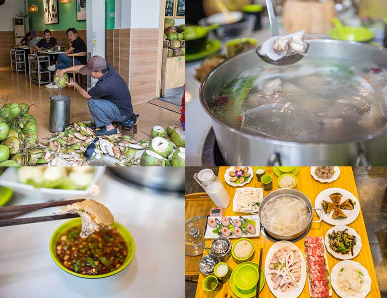 椰子鸡来三亚也是必吃的,现砍椰子原汁直接倒入锅中,滑嫩的文昌鸡只需煮3分钟就捞起来,蘸上秘制酱料,一盘都不够吃的。